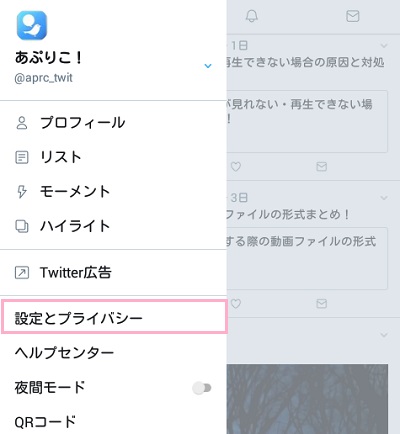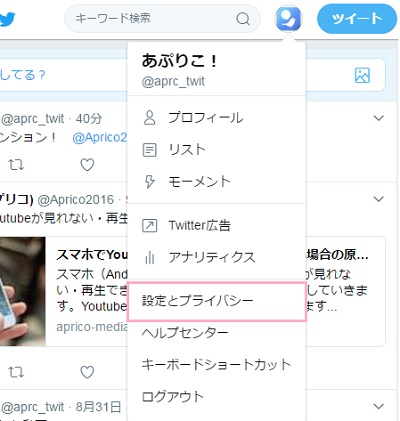 まずブラウザでTwitterを開き、右上にあるユーザーアイコンをクリックし、メニューの「設定とプライバシー」をクリックします。