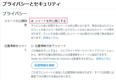プライバシーの欄にある「ツイートの公開設定」で「ツイートを非公開にする」のチェックボックスをクリックしオンにして、画面下部にある「設定を保存」をクリックしましょう。