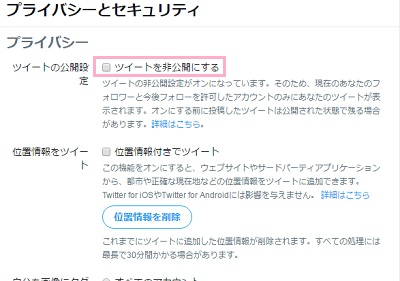 プライバシーの欄にある「ツイートの公開設定」で「ツイートを非公開にする」のチェックボックスがオンになっているので、クリックしてオフにしてから画面下部にある「設定を保存」をクリックしましょう。