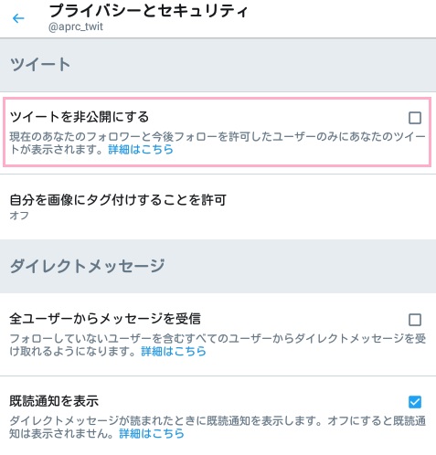 ツイートの「ツイートを非公開にする」のチェックボックスがオンになっているので、タップしてオフにしましょう。 オフにする場合もパスワード入力は求められません。