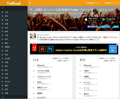 各地域ごとのトレンドを知りたい時は「Twitterend」が便利です。 日本の各都道府県ごとの最新トレンドを一覧で見ることができます。