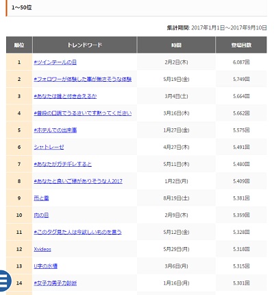 2016年9月から現在までのトレンドワードがランキング形式でまとめられており、バズった日時とワードの登場回数が一目で分かります。
