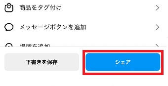キャプションなど必要な項目を入力したら下の「シェア」をタップします。