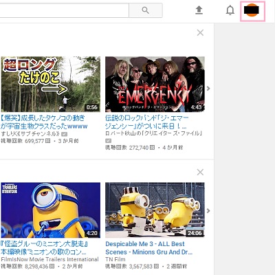 まずはYoutubeにアクセスし、ホーム画面右上の自分のアカウントアイコンをクリックします。