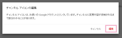 チャンネルアイコンの編集についての注意点が表示されます。注意に書かれている通り、チャンネルアイコンは自身のGoogleアカウントとリンクされるのでその点を留意しましょう。