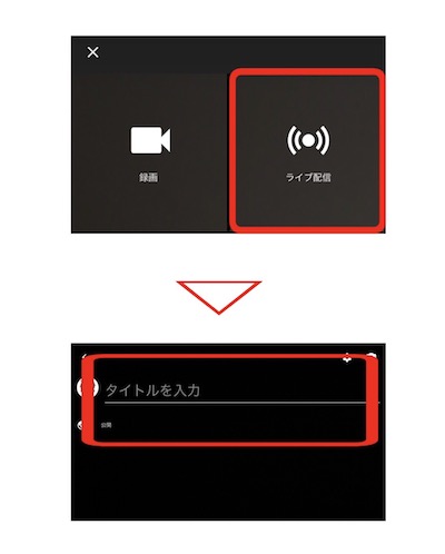起動すると上部のアイコンにビデオマークがあるので、そちらをタップします。録画とライブ配信、その下には許可された自身のフォルダ内の動画データが表示されます。 ライブ配信をする際は、ライブ配信をタップし、タイトルと公開状態を設定できます。設定すると下に次へボタンが表示されます。 次へに進むと突然3秒後にサムネイル画像を撮影する画面になり撮影されます。