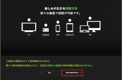 「契約を解除する」を選択すると、本当に解約するのか確認を求められますがページを下にスクロールします。 ページの下部に右図のように「契約の解除を続ける」ボタンがあるのでそれを選択します