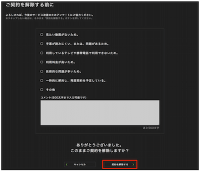解約する前にアンケートの回答求められます。回答しないと解約できないということはないのでスキップ可能です。 左図のようにページ下部に「契約を解除する」を選択します
