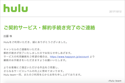 今回の記事では、解約方法について説明いたしました。 僅か数ステップで退会が完了するので、無料期間が終了してしまった、もう観たい動画がない、他の動画配信サービスに乗り換えたい、など退会をお考えの方は上記の解約方法をご参考ください。 しかし、日割りができなかったり、退会した瞬間からサービスの利用ができなくなるので注意も必要です。 「huluの解約に関する注意」を一度読み、解約をお考えください。