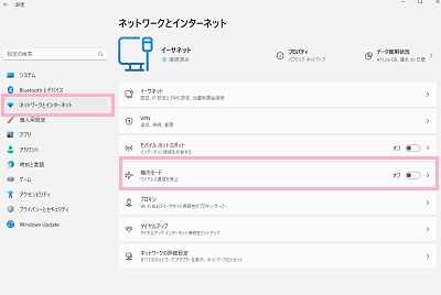 Windows11では飛行機の機内で通信を無効化するための「機内モード」が搭載されています。機内モードが有効になっていてBluetoothが利用できていない可能性もあるため、機内モードになっていないか確認してみましょう。もし機内モードになっている場合は、オフにしましょう。