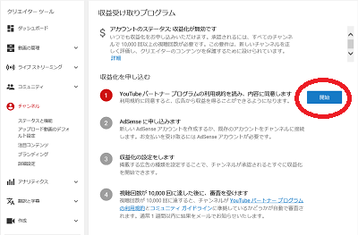 パートナープログラムに登録後、②のAdSenseに申し込みますの横にある〔開始〕をクリックします。