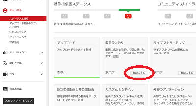 チャンネルの項目をクリックし、収益受け取りの項目の〔有効にする〕をクリックします。