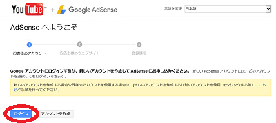 すると、AdSenseの登録画面に移動します。 AdSense登録したいGoogleアカウントでログインしましょう。 特別な理由などがない限り、YouTubeで収益化させたいアカウントでログインして大丈夫です。