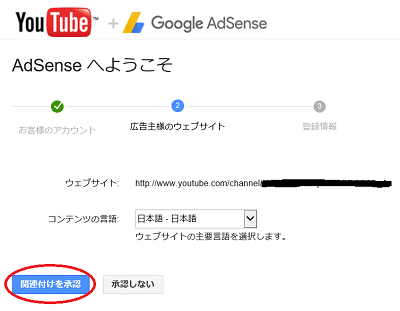 (筆者は既にAdSenseに登録していたため〔関連付けを承認〕になっていますが、初めて登録する場合は〔続行〕と表示されます)
