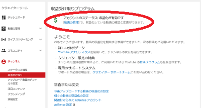 数時間~数日の審査があり、審査に通過すると収益受け取りプログラムのところに収益化が有効ですと表示されます。