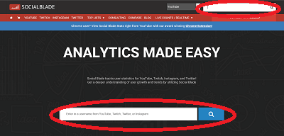 SOCIAL BLADEの利用方法は丸で囲ったところに調べたいユーチューバーのチャンネルUsernameを入力するだけの簡単な仕組みです。