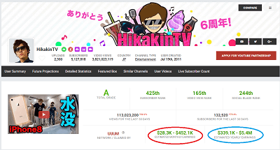 UsernameとはチャンネルURLの末尾に来るものです。今回調べるユーチューバーの場合だと、 https://www.youtube.com/user/HikakinTV ←これがチャンネルURLです。 この場合のUsernameはuser/の後ろに記載されている「HikakinTV」となります。 それでは実際に予想収益を調べてみましょう。