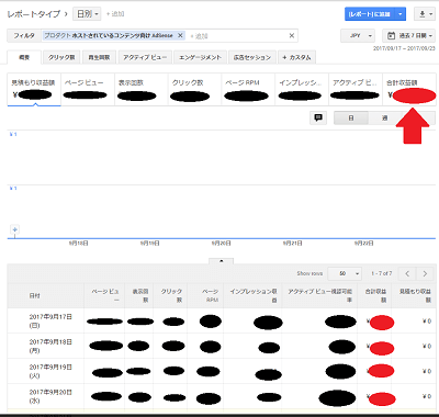 するとこのような画面が出てきます。YouTubeの規約上、数字の公開はできませんが、赤丸で囲んだところに実際に得た収益が記載されています。 上の赤丸は週合計金額(ここは月ごと、年ごとに変えることも可能)、下の赤丸は日ごとの広告収入が記載されています。