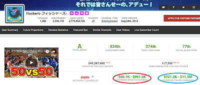 このように世界ランキングや再生数・登録者の増加率などが記載されていますが、収益の欄は右下の丸で囲ったところです。 赤丸が月収益の予想、青丸が年収益の予想となっています。