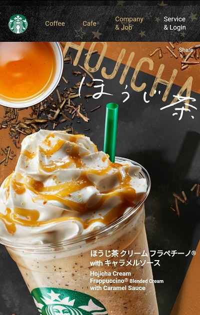 今の新商品「ほうじ茶クリームフラペチーノwithキャラメルソース」の公式ページが開きました。 とても美味しそうで、おもわず飲みに行きたくなってしまいますね。