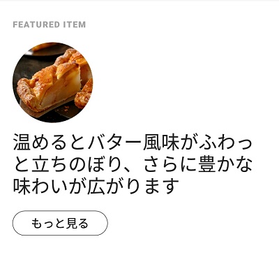 「FEATURED ITEM」では、おすすめの商品を教えてくれます。 今の季節のおすすめ商品はアップルパイだそうです。単品でも美味しそうですし、とてもコーヒーに合いそう!