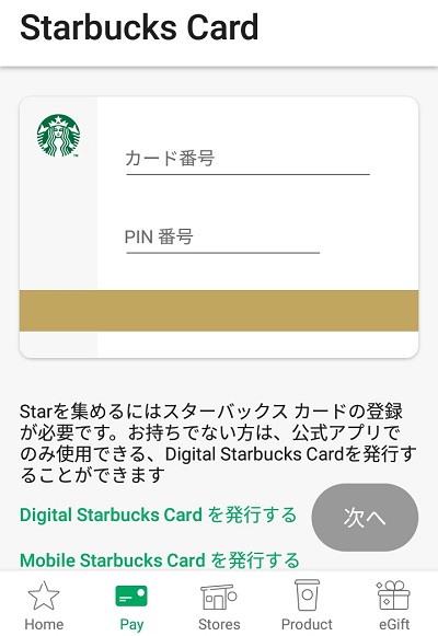 画面下部のメニューの「Pay」をタップすると、「Starbucks Card」の登録画面に移ります。 手持ちのStarbucks Card裏面にある16桁の番号と4桁のPIN番号を入力し「次へ」をタップし、名前や電話番号などの必要事項を入力して「登録」をタップし、利用規約に同意すればアプリにStarbucks Cardが登録できます。 Starbucks Cardをアプリに登録するとアプリでカードの残高を確認することができるようになるほか、スターバックス店舗でのお会計の時にバーコードを表示してスキャンしてもらうことですぐにお支払いができるようになります。また、クレジットカードを持っていればアプリ上でカードに金額チャージも可能です。