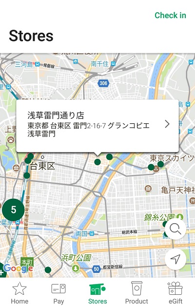 画面下部のメニューの「Stores」をタップするとGoogle mapが開き、自分の現在地の近くのスターバックス店舗が検索できるようになります。