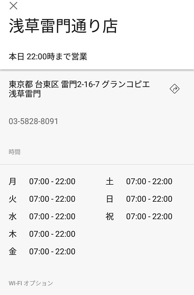 住所・電話番号・今日は何時まで営業しているのか・営業スケジュールが一目で分かるようになっているほか、ルート案内やWi-Fiオプションの有無を確認することなどもできます。