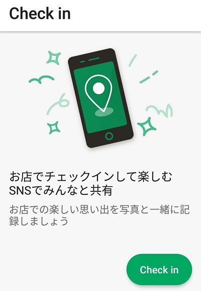 ホーム画面や「Stores」メニューにある「Check in」ボタンを押すと、チェックインが行えます。 チェックインすることで、SNSに写真やコメントをアップして楽しむことができます。