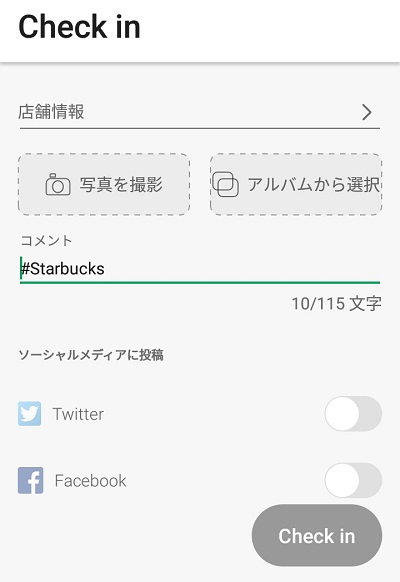 店舗情報・写真・コメントを記入して、連携するSNSのボタンをタップしたら「Check in」ボタンをタップしましょう。