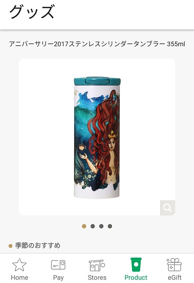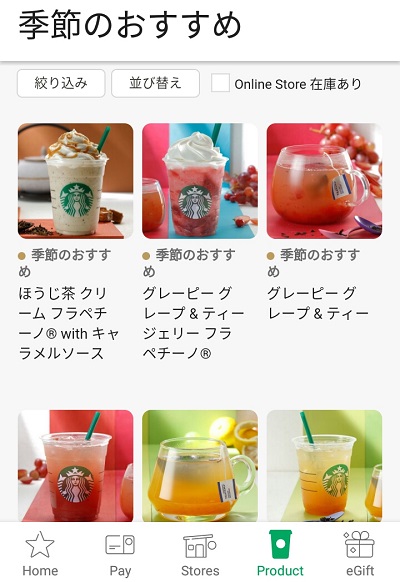 画面下部のメニューの「Product」をタップすると、アプリ上で商品情報をチェックすることができます。 スタバの店舗で提供しているコーヒーメニューから、器具やグッズなどを一覧で見ることが可能です。