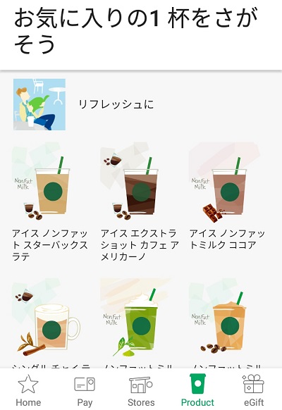 どの飲み物を頼もうか迷った時に便利なのが、Productメニューのトップにある「お気に入りの1杯をさがそう」ボタンです。 今の気分や飲みたいフレーバーでアプリがメニューを探してくれます。