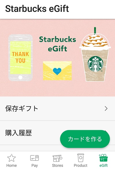 画面下部のメニューの「eGift」をタップすると、ギフトカードを発行したり、保存されているギフトカードの確認ができます。