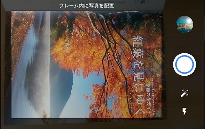 まずはスキャンしたい写真や切り抜きなどをできるだけ平らな場所に置いて、アプリの撮影フレーム内に収めます。その状態で右側の白い丸型の撮影ボタンをタップしましょう。 ※画像は写真ではなく雑誌ですが、同じ方法で問題なくスキャンできます。
