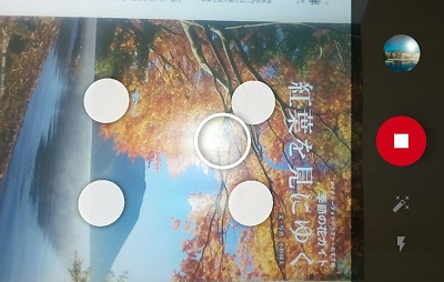 写真の上に4つの白丸と、中央にそれを読み取る円形のポインタが表示されます。 スマートフォンを動かして4つの白丸それぞれにポインタを重ねることで、スキャンが行われます。どの白丸からでもいいので、早速ポインタを合わせてみましょう。