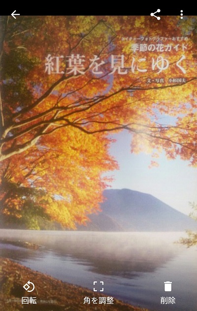4つの白丸を全て読み取るとあっという間にスキャンが始まり、数秒でデジタルデータが完成してしまいました。撮影中の画像を見ていただければ分かると思いますが、フラッシュを焚いているのにもかかわらずしっかりとフラッシュの光が消えています。 画面上部のシェアボタンからは、SNSなどにシェアしたりGoogle ドライブに保存などが行えます。 画面下部のメニューで画像の回転、角の調整が行えます。もし撮影に失敗してしまった時はゴミ箱のアイコンが削除ボタンになっているので、削除してやり直してみましょう。