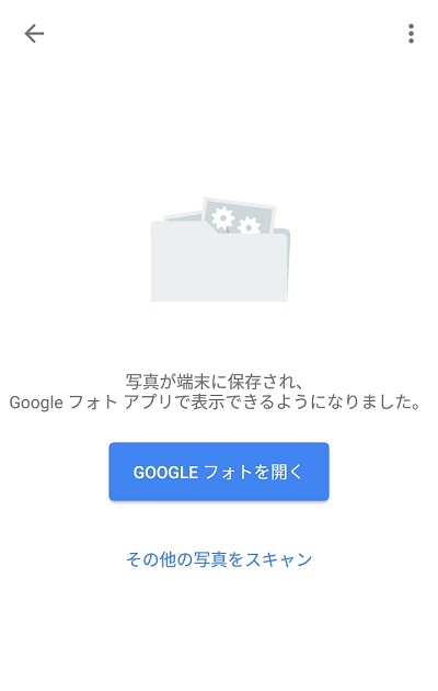 保存が完了すると「写真が端末に保存され、Google フォト アプリで表示できるようになりました。」と表示されます。 画面中央の「GOOGLE フォトを開く」をタップすればGoogle フォトアプリが開き、そちらで編集などが行えます。続けてスキャンを行いたい場合は「その他の写真をスキャン」をタップしましょう。