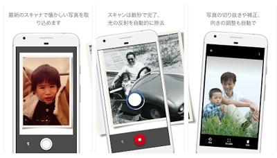 写真をスキャンするのに難しい知識や操作を必要としない。 撮影時に光の反射などが起きても自動的に消去してくれる高度な補正機能。写真の四隅を検出して自動的にトリミング。 直線スキャン・長方形スキャンに遠近の補正機能もあり、更に角度補正機能も付いているため多少ずれた位置で撮影をしてもずれていないデジタルデータに補正。 このように高度な機能を複数搭載していながら、たったの数秒で思い出の写真がスキャンできてしまいます。 また「Google フォト」と連携しているので、スキャンした写真をGoogle フォトアプリにバックアップすることが可能です。こちらも無料ですし、ムービー・フィルタなどの編集機能が備わっているので非常に便利です。